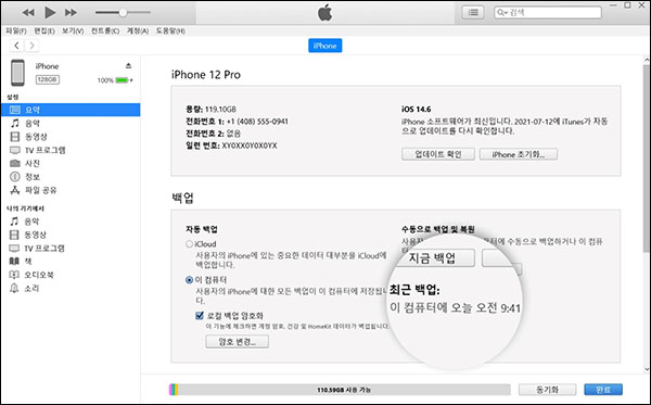 - PC에서 해당 iPhone을 찾아서 "지금 백업"을 클릭합니다.